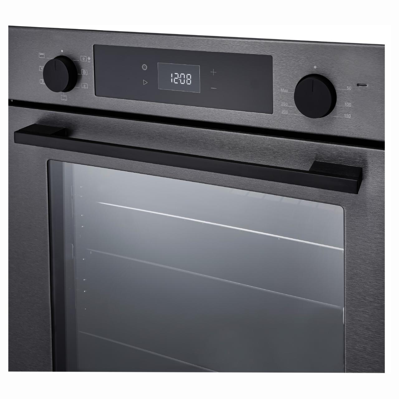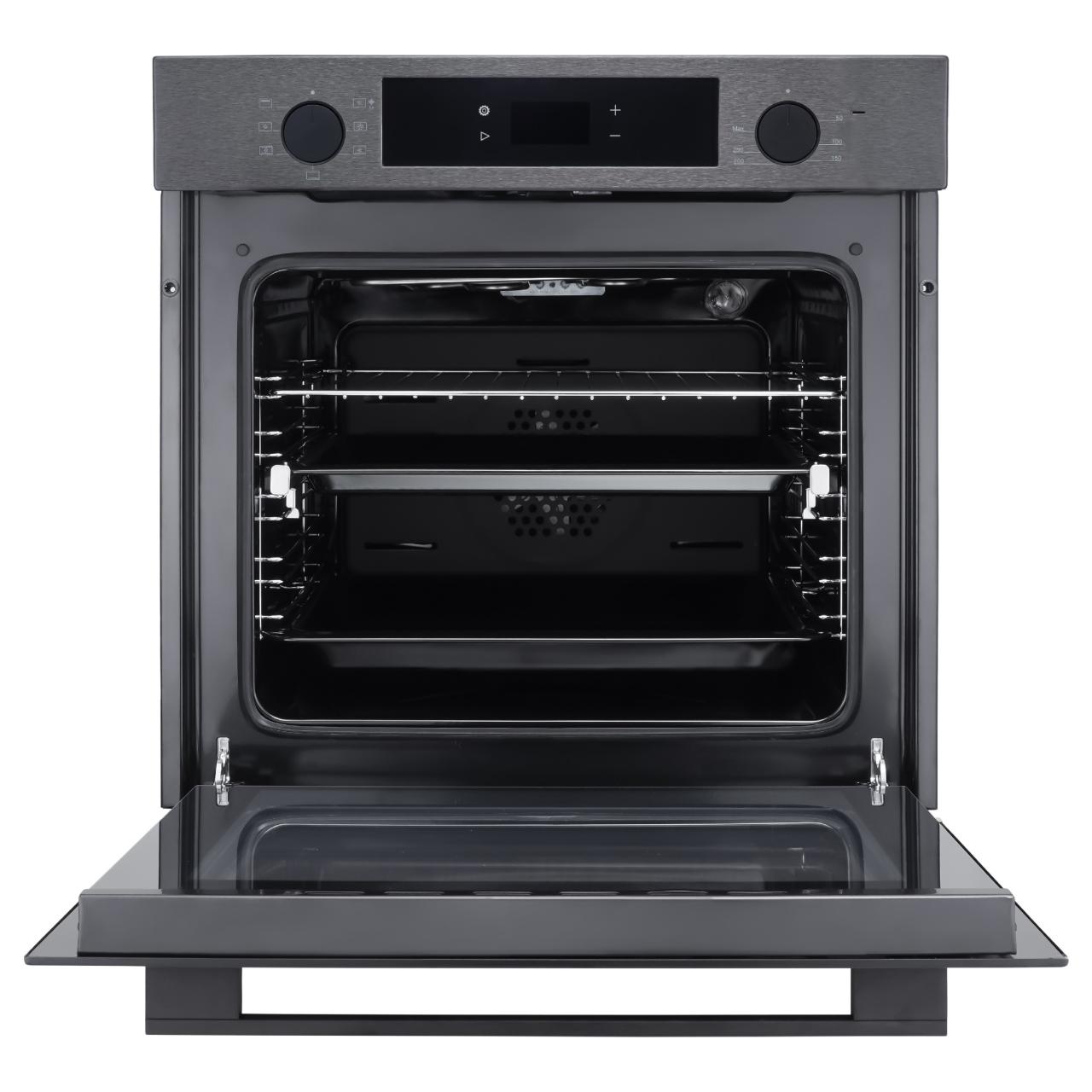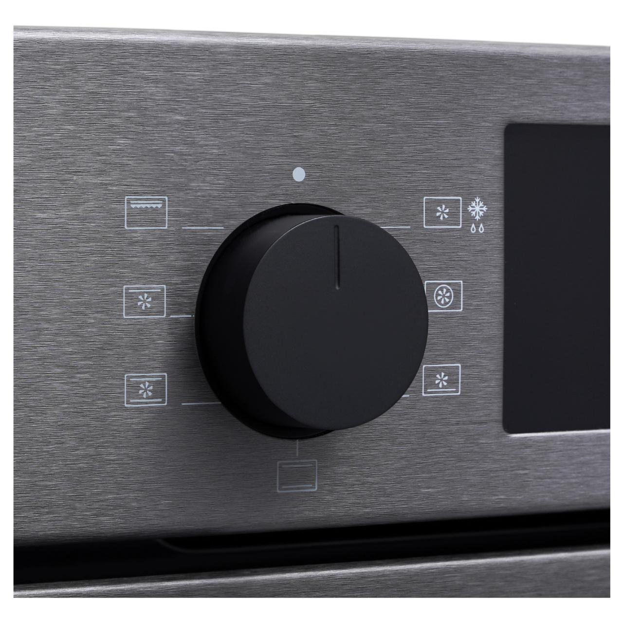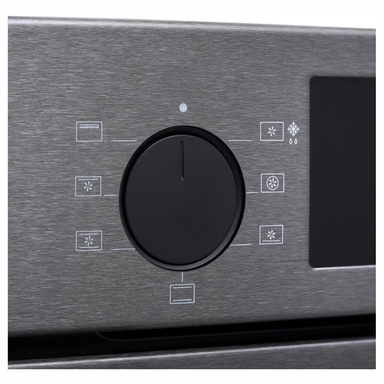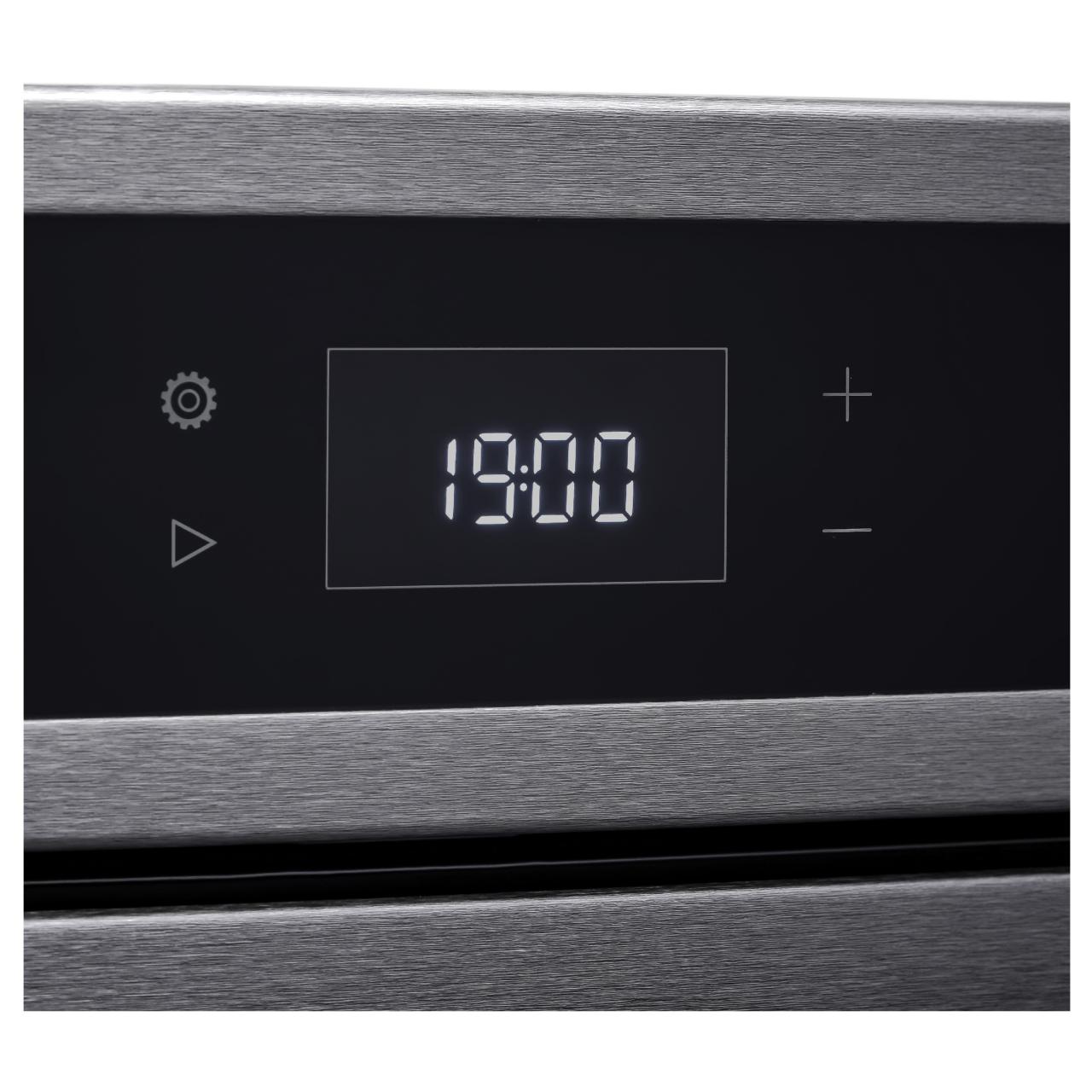 Управление осуществляется с помощью утапливаемых переключателей и сенсорного программатора, что делает процесс приготовления еды удобным и простым. Освещение духового шкафа осуществляется галогенной лампой, которая обеспечивает яркий и четкий свет. Оснащен дисплеем, который позволяет легко управлять всеми функциями устройства.