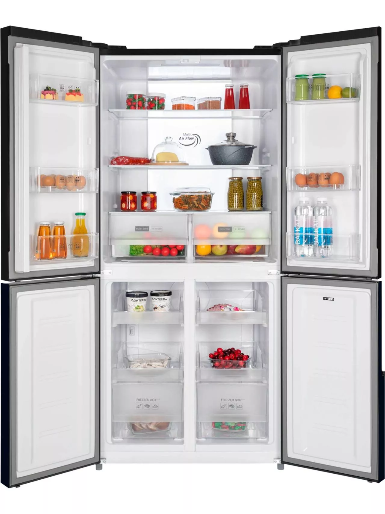 4-х дверный холодильник имеет единое пространство верхних полок холодильной камеры, чтобы удобно было размещать габаритные кастрюли и контейнеры. Прочные полки из закаленного стекла можно регулировать по высоте, а ящики в холодильной камере предназначены для хранения овощей и фруктов и оснащены влажной зоной свежести и сухой.