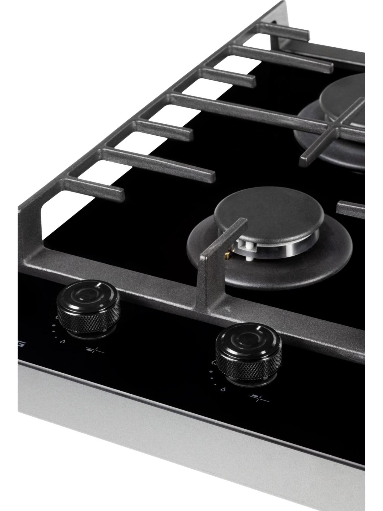 Газовая часть включает две конфорки с автоматическим розжигом от ручки и системой газ-контроля для безопасной эксплуатации. Чугунные решетки обеспечивают устойчивость посуды и рассчитаны на интенсивное использование. Наличие сенсора распознавания посуды и индикатора остаточного тепла добавляет уверенности при работе.